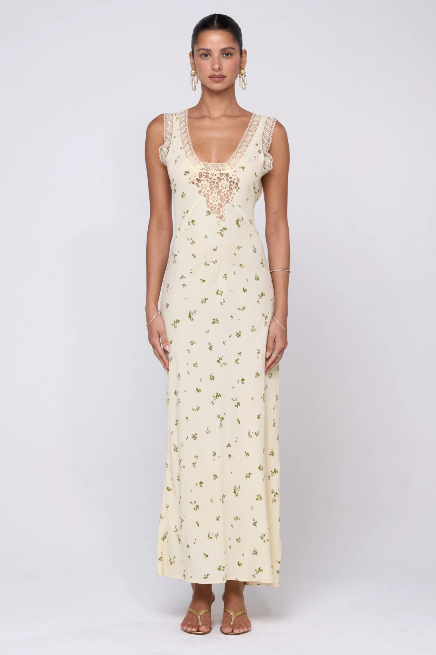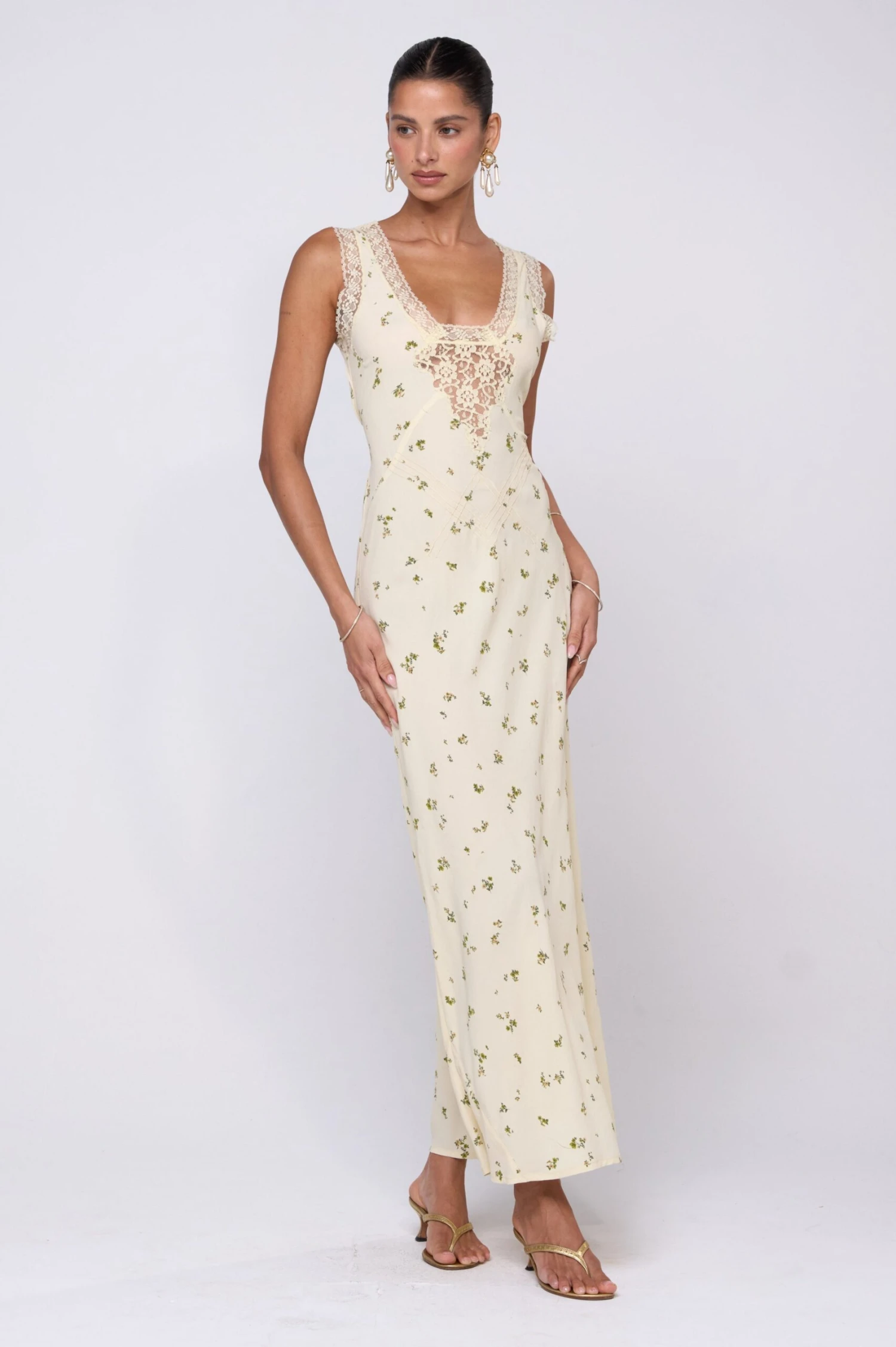 Step into effortless elegance with the Aimee Dress. This maxi slip dress features delicate lace detailing that adds a touch of romance to your look. Its flowing silhouette moves gracefully with you, perfect for sunny days or evening soirees.Â