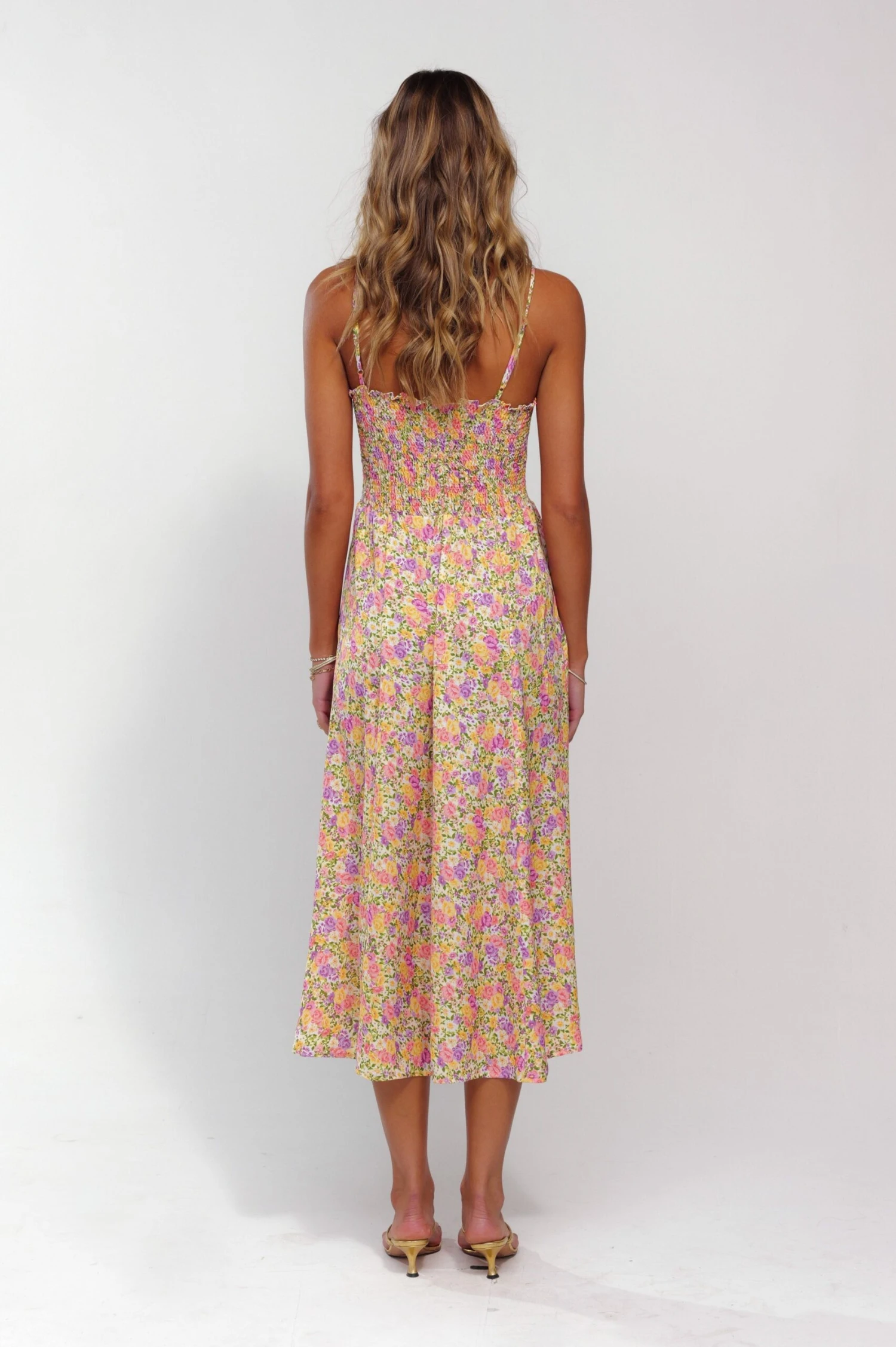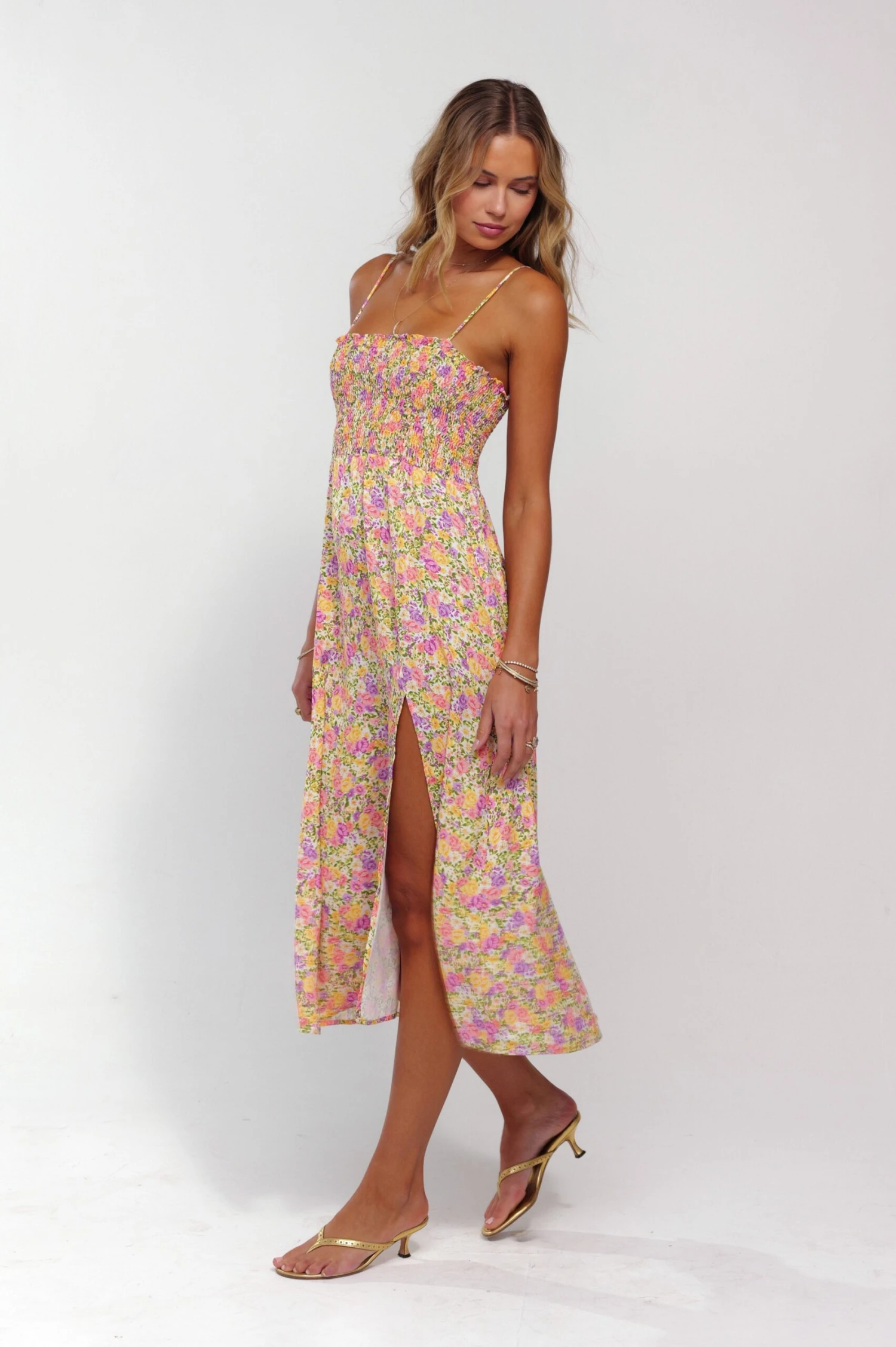 Expertly designed for a stylish and comfortable fit, the ASHLEY MIDI dress features a smocked bodice that accentuates your figure and a chic midi length. Perfect for any occasion, the front slit adds a touch of elegance, making this dress a must-have for your wardrobe.