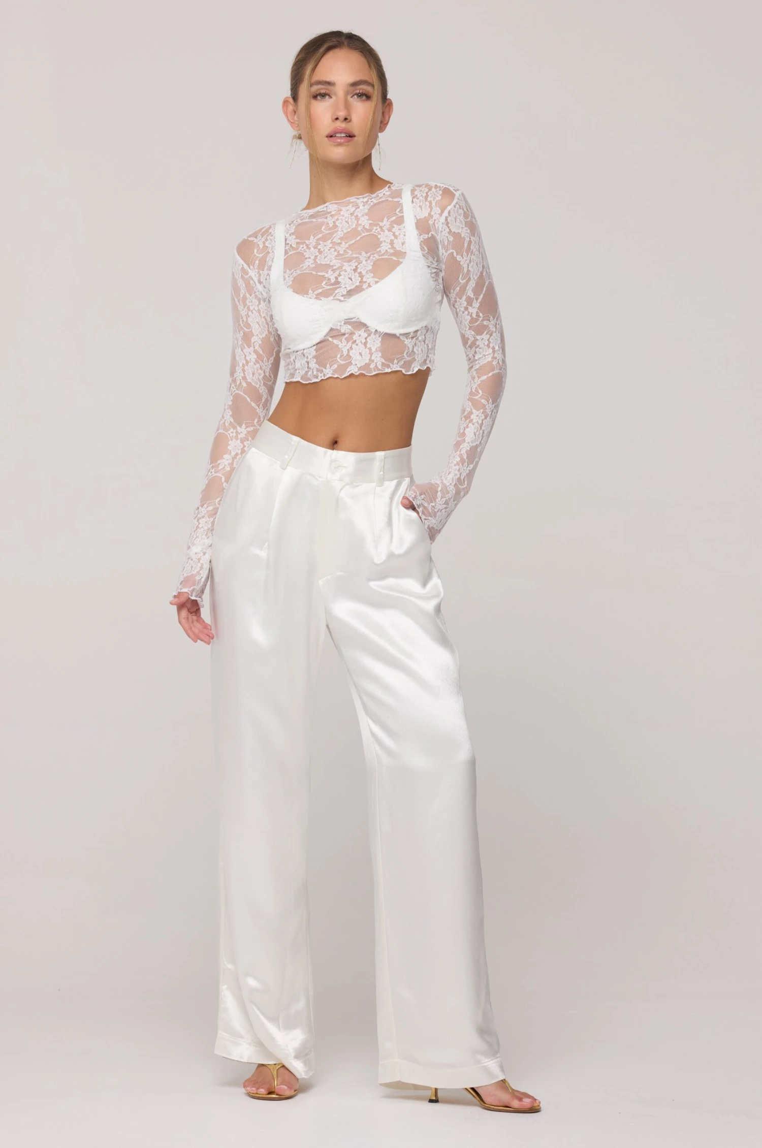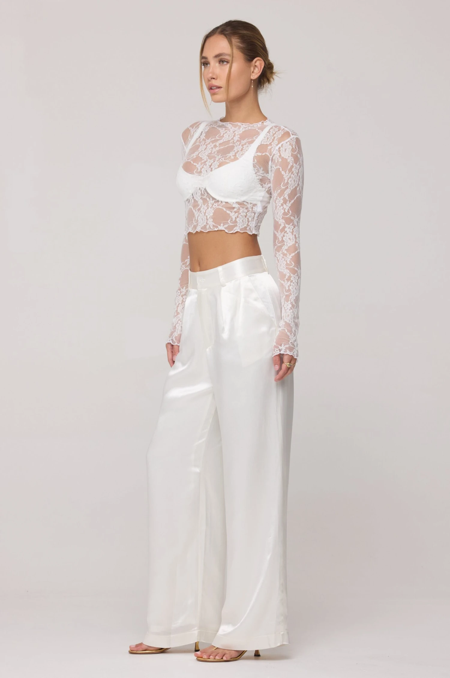 The Ida Lace Top in White is a stylish and versatile addition to any wardrobe. Made with delicate lace, this cropped top features a playful lettuce hem and sheer details, adding a touch of femininity to any outfit. Perfect for dressing up or down, this top is a must-have for fashion-forward individuals.