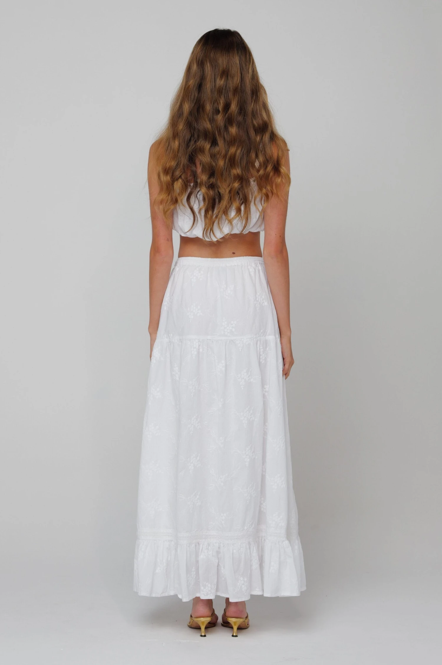 Add some whimsy to your wardrobe with the Jackson Skirt in White Cotton. This tiered maxi skirt is made from soft and breathable cotton, ensuring comfort without compromising style.