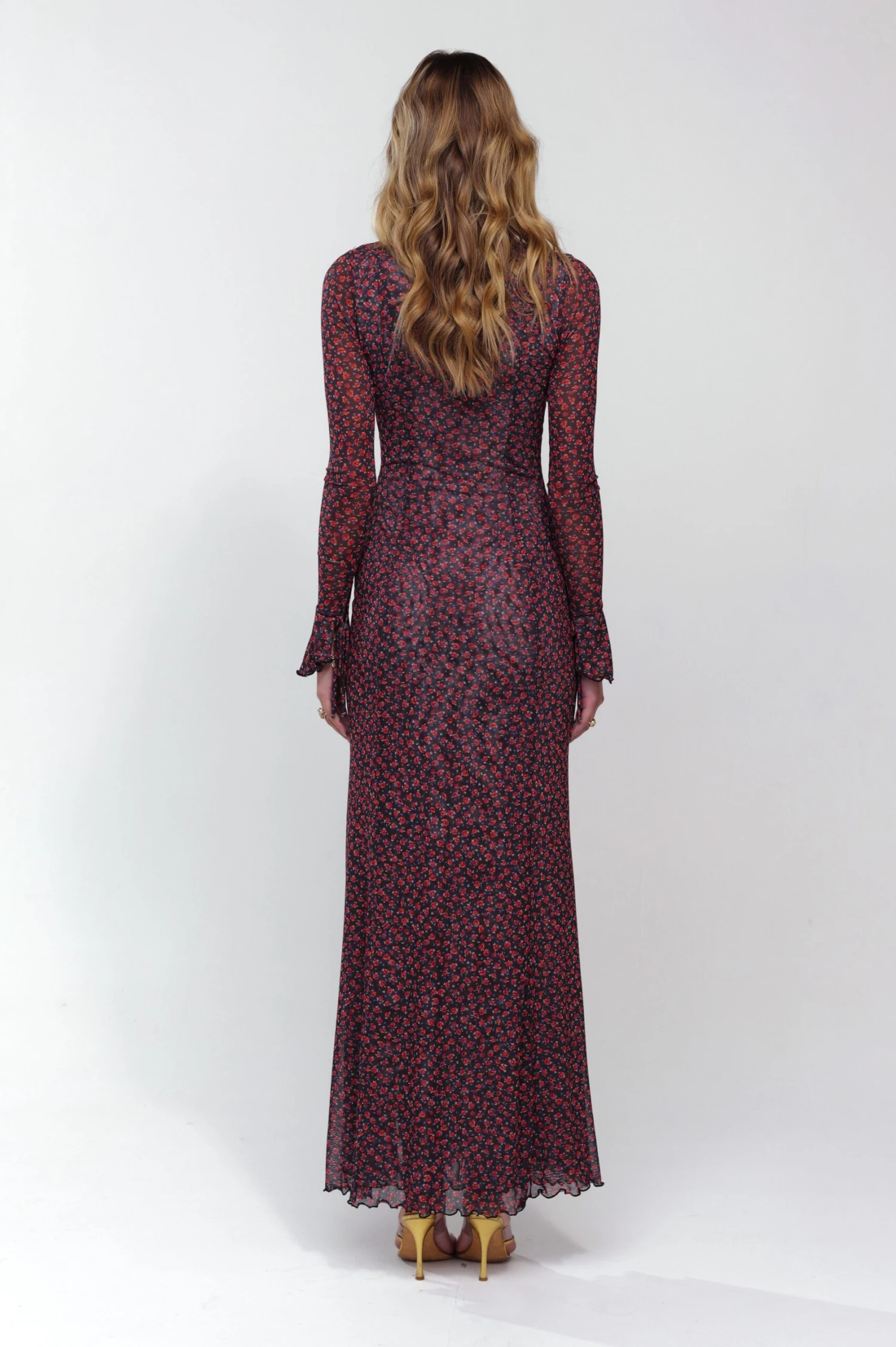 The Lennon Maxi features a drop neckline and tie detail, front slit, and bell sleeves. Elevate your style with this elegant and sophisticated design, perfect for any occasion.