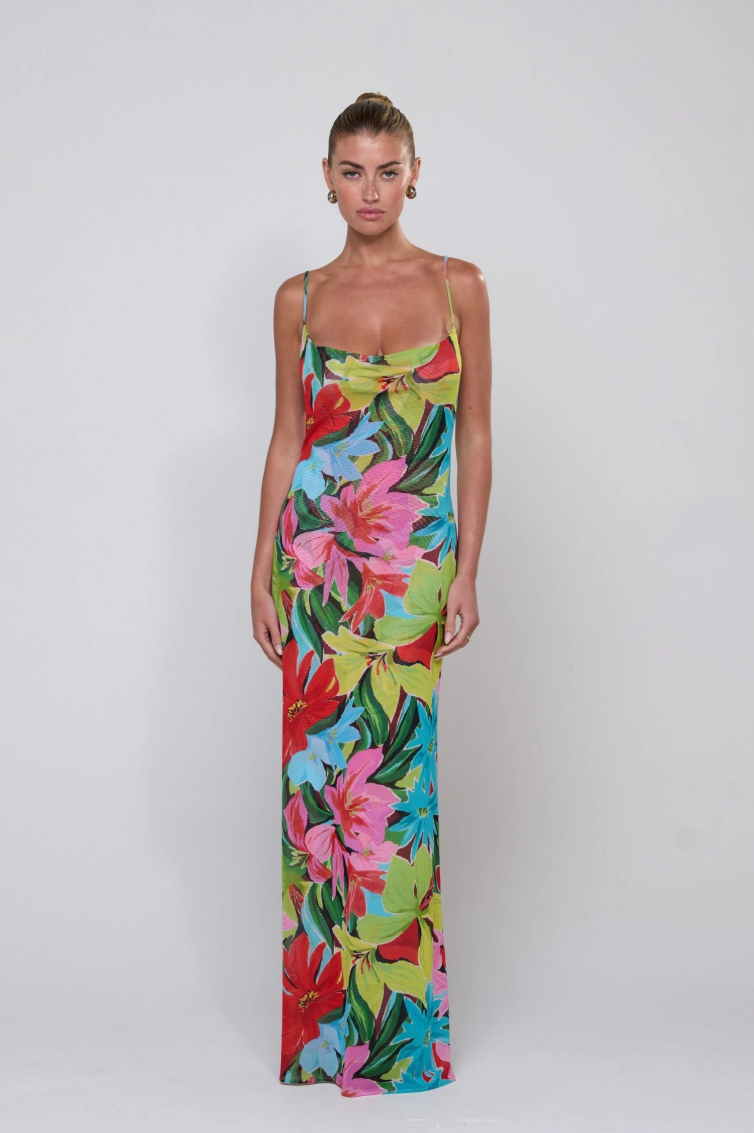 Get ready to turn heads in the Margot Mesh Maxi in! This chic cowl neck maxi dress will make you stand out with its unique design and vibrant color. Look effortlessly stylish with this must-have piece.